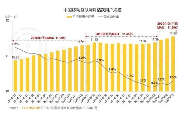 QuestMobile《2020中国移动互联网春季大报告》显示,第一季度月活跃用户规模逆势上升,达到11.5亿,创下了1.5%的同比增长率,相比2019年末,增长了1700万。