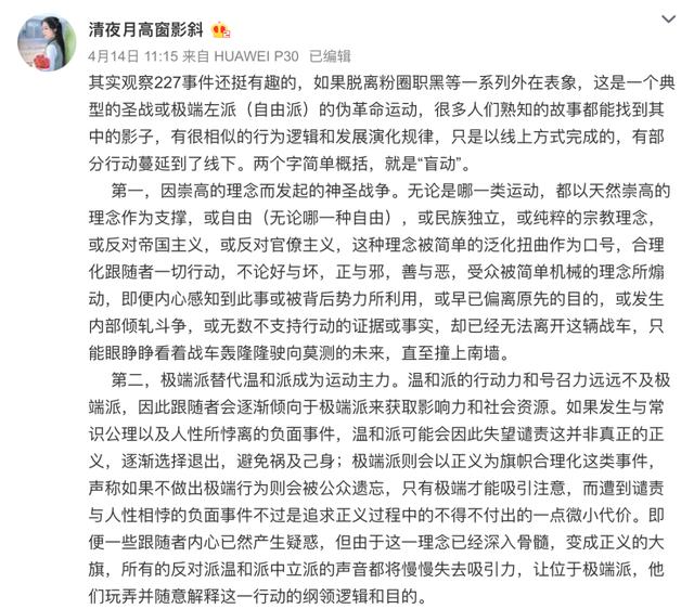 之前看到一个博主分析227事件,感觉蛮有意思的,她概括为“是一个典型的圣战或极端左派(自由派)的伪革命运动。两个字简单概括,就是‘盲动’。”的确是这样,从一开始呼吁创作自由、反对恶意举报,到抵制明星、抵制资本,反对并举报与明星有所关联的无关第三方,抵制品牌、影视作品,甚至是不符合他们心理预期的新闻媒体和社交娱乐平台,想让一个明星“社会性死亡”,这所有的事和当初所呼吁的创作自由还有关系吗?一切都失控了,但遗憾的是没人能冷静下来,这是不会有结果的战争,也是没有赢家的对战。