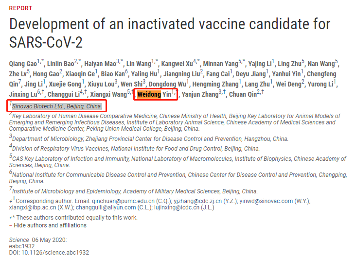 5月6日Science在线发表的题为“Rapid development of an inactivated vaccine candidate for SARS-CoV-2”的研究论文中(主要是说明新冠疫苗在动物试验中的有效性),参与主体为“Sinovac Biotech Ltd”,即科兴控股生物技术有限公司,该公司曾在美国上市,通过科兴控股(香港)控制着北京科兴和科兴中维。