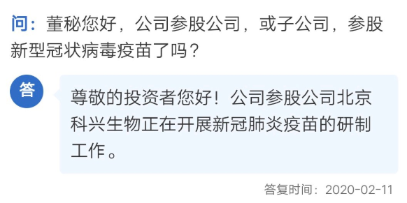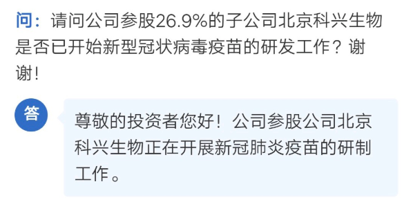 同时,在今年2月份,未名医药在深交所互动平台也多次表示“参股公司北京科兴正在开展新冠肺炎疫苗的研制工作”。