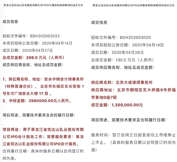 据微信自媒体“四大新鲜事儿”披露,最近,完达山为IPO采购了法律服务及会计服务,并开始为启动IPO做准备。其中,法律服务中标单位为北京大成律师事务所,会计服务中标单位为安永华明会计师事务所。