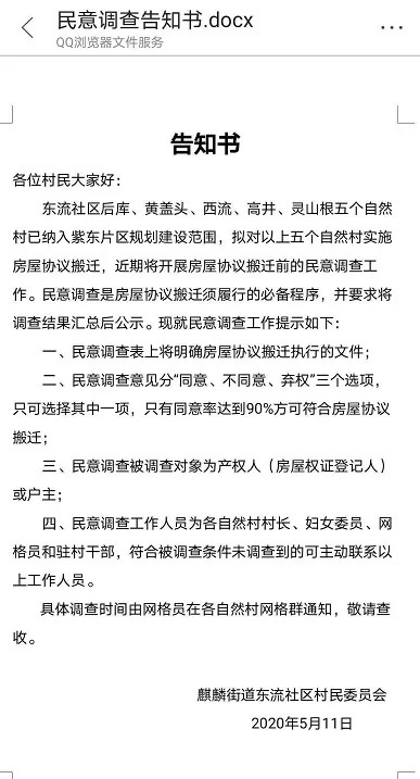 据麒麟街道东流社区5月11日发布的一则民意调查告知书,东流社区后库、黄盖头、西流、高井、灵山根五个自然村已纳入紫东片区规划建设范围,拟对以上五个自然村实施房屋协议搬迁,近期将开展房屋协议搬迁前的民意调查工作。