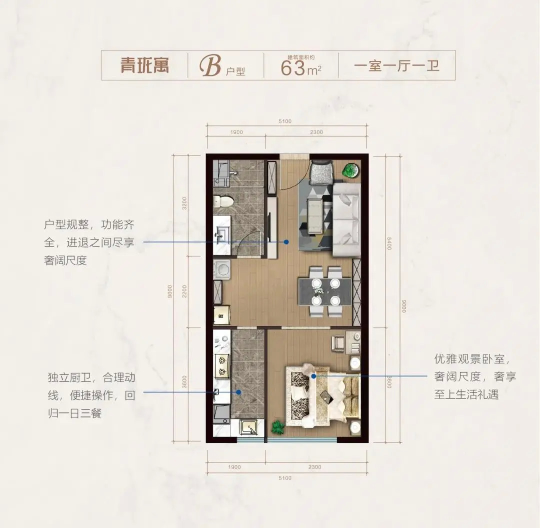 其酒店式公寓主力户型35㎡,B-2号楼为独立商业体,其余所有楼栋的1层均为商业,B-7号楼为公寓,B3-B6为写字楼。