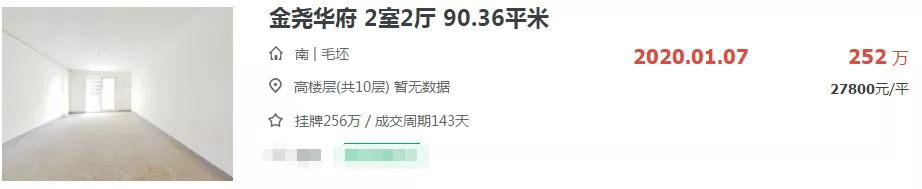 金尧华府由于小区较新,二手房挂牌均价为28616元/㎡,今年1月初成交一套房源单价为27800元/㎡。