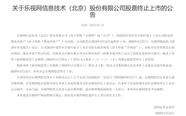 2020年4月27日,乐视网披露的《2019年年度报告》显示,公司2019年度经审计的归属于上市公司股东的净利润、扣除非经常性损益后的净利润、期末净资产均为负值,且财务会计报告被大华会计师事务所(特殊普通合伙)出具了保留意见的审计报告,触及了深交所股票终止上市情形,因此深交所决定,乐视网股票终止上市。