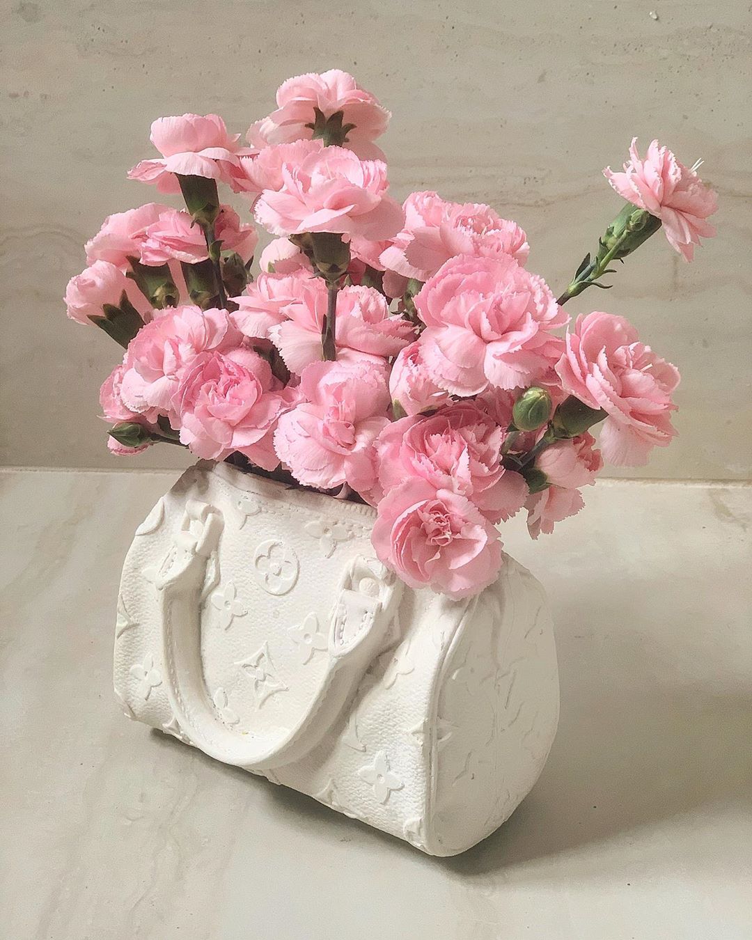 由Louis Vuitton出品和Speedy手拿和来自Jacquemus的迷你包也出现在了Bodega Rose的创作名单上,两件花瓶外表上对皮革纹路的细腻模仿使其看起来就像是真实的包袋。而如果你是球鞋迷,Bodega Rose也为你准备了不少惊喜,Nike“反钩”Air Max花瓶和Timberland经典登山马丁靴的花瓶想必能让你的球鞋收藏架更为熠熠生辉。