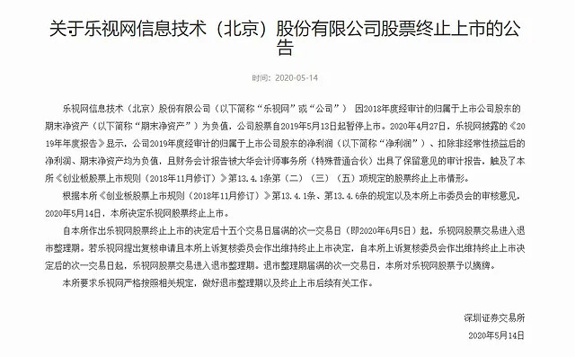 按照《上市规则》要求以及深交所上市委员会的审核意见,2020年5月14日,深交所决定终止乐视网股票上市。