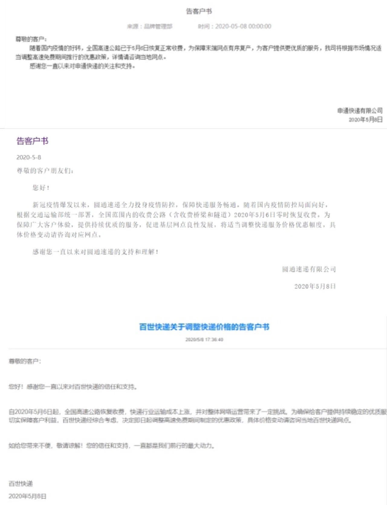 5月初,申通、圆通、百世、韵达、中通等快递公司先后宣布,将调整高速免费期间实行的快递服务价格优惠幅度,原因是自2020年5月6日起,全国高速公路恢复收费。言外之意就是,快递公司要集体涨价。