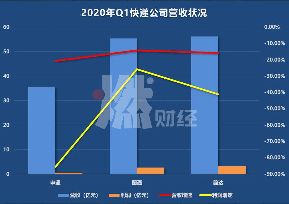 再翻看各快递企业的财报,申通一季度营收35.73亿元,同比下降20.72%,净利润5836万元,同比下降85.6%;圆通一季度营收55.34亿元,同比下降14.12%,净利润2.71亿元,同比下降25.74%;韵达一季度营业收入56.2亿元,同比下降15.9%,净利润3.3亿元,同比下降41.1%。