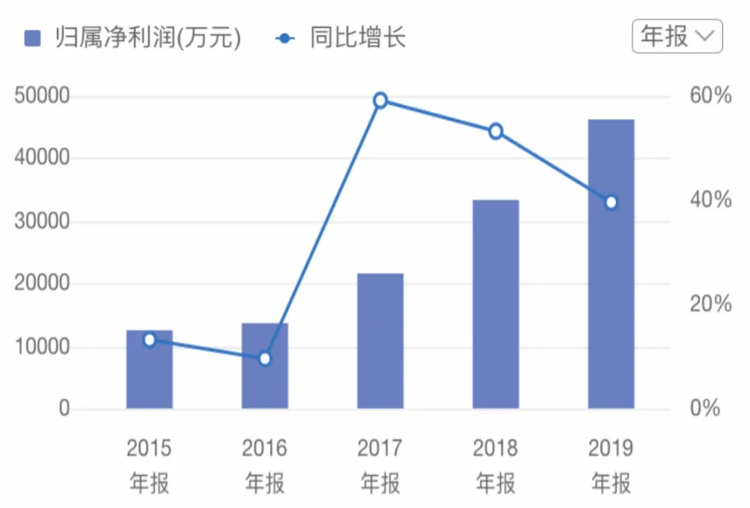 2017年-2019年,其营业收入增长率分别为34.25%、31.05%、22.52%,归属净利润增长率分别为59.05%、53.34%、39.44%。