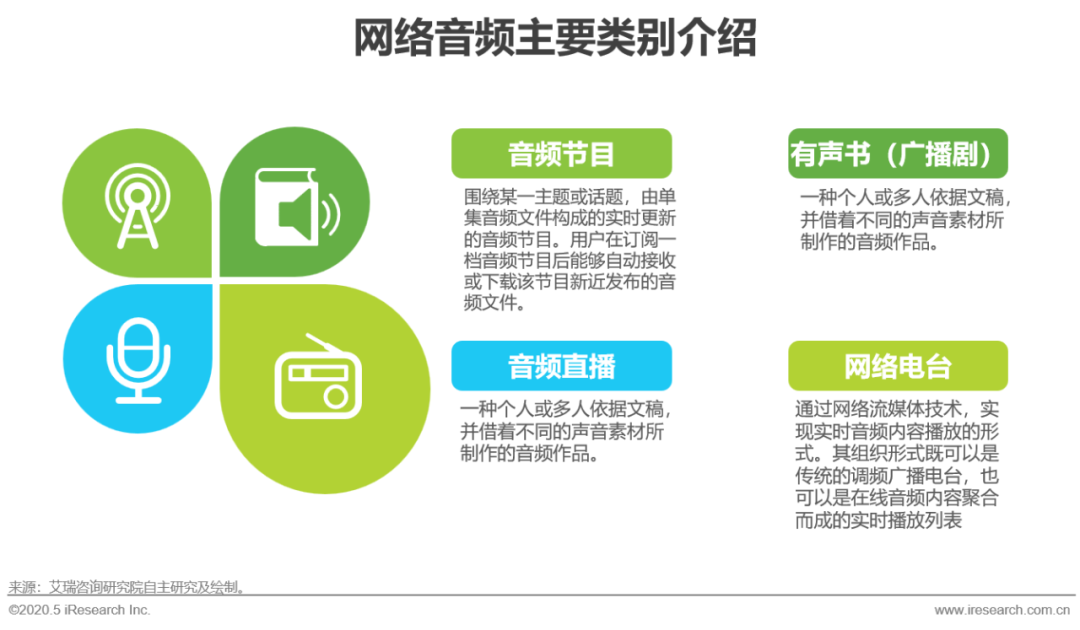 狭义的网络音频:由于完整的数字音乐专辑或音乐流媒体服务涉及到唱片公司复杂的版权交易,且数字音乐已经形成较为独立的产业体系,因此数字音乐不归为狭义的网络音频。目前国内网络音频主要包括音频节目(播客)、有声书(广播剧)、音频直播以及网络电台等实现形式。本报告的研究范畴是狭义的网络音频。