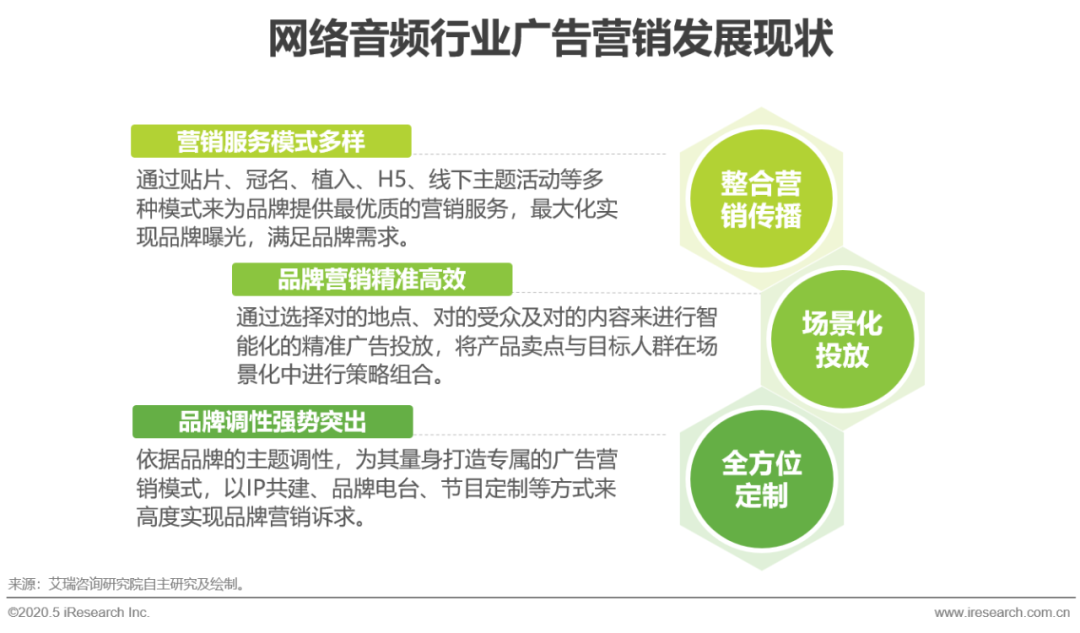 网络音频行业的广告营销在不断发展过程中形成了自身特色,具体表现在能够通过发挥音频平台的流量等优势,以多样化的广告营销模式来为品牌提供整合营销传播服务,最大化实现品牌曝光。其次基于技术优势及第三方高效生态合作等方式,实现对用户的立体洞察从而进行有针对性的品牌精准营销,能够强势的帮助品牌渗透用户。最后音频平台依据品牌的自有主题调性,为其打造专属的定制化广告营销服务,能够帮助品牌强有力的建构品牌形象,高度实现品牌营销诉求。