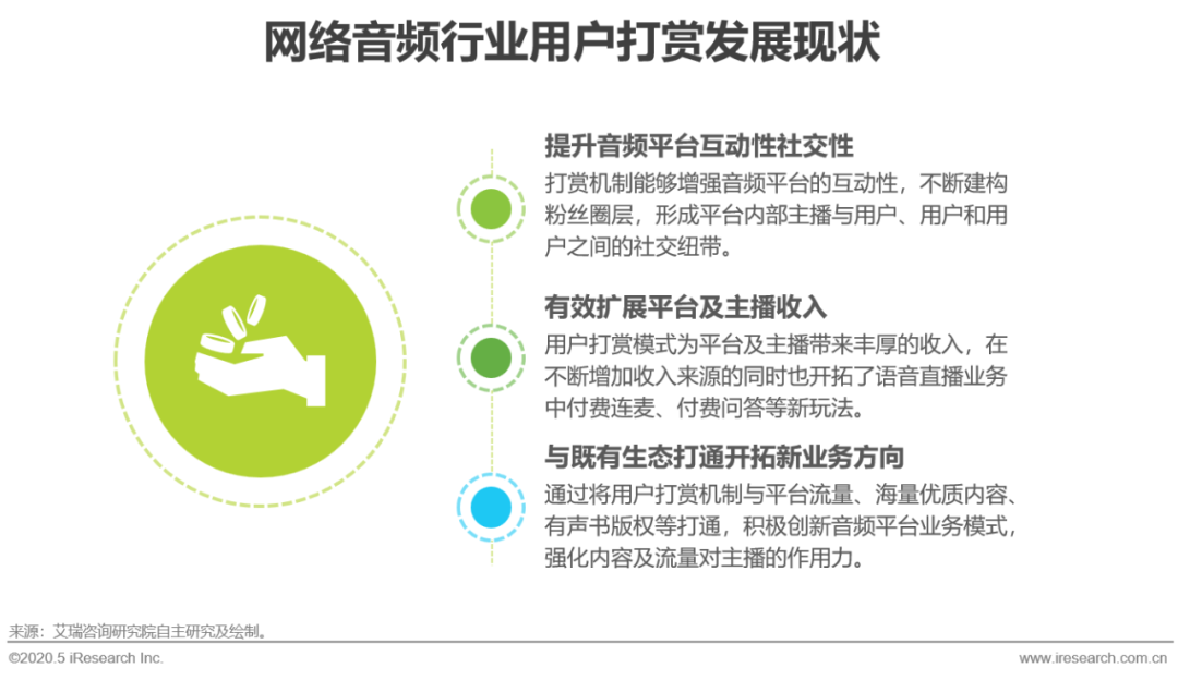 音频平台的用户打赏机制主要建立在平台语音直播业务模式的基础上,通过打造平台内部主播与用户、用户和用户之间的社交纽带,增强整个音频平台的互动性,从而有效提升平台用户粘性。用户打赏模式的不断发展丰富了平台及主播的收入来源,也提高了整体收入水平,用户打赏机制同时也带动了语音直播业务促生新玩法,付费连麦、付费问答成为新的收入方式。此外,通过将用户打赏机制与平台流量、海量优质内容、有声书版权等打通,积极创新音频平台业务模式,强化内容及流量对主播的作用力。
