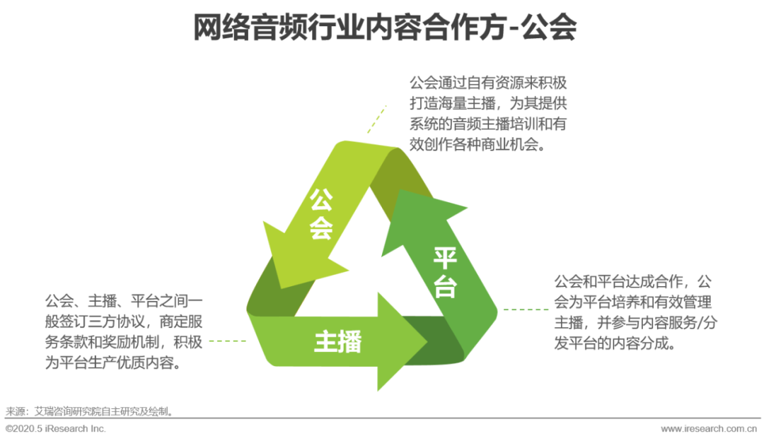 网络音频的内容生产者和平台之间的合作是整个产业蓬勃发展的重中之重,一个是能够确保内容源源不断供给的内容生产方,一个是能够将内容呈现给受众的内容呈现平台,二者之间有效的合作才能保证内容从供给到分发的有效呈现。而公会就扮演了建构音频平台、公会及主播之间内容生产闭环的角色。公会联合优质的音频内容生产者,对优质内容生产者进行统一运营和管理,并参与内音频平台的内容分成。