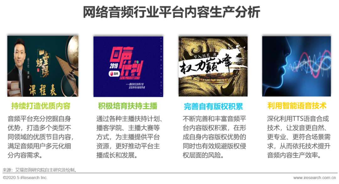 网络音频核心竞争力体现在内容层面的竞争,因而围绕平台内容进行护城河的有效建构是不断提升音频平台竞争力的重中之重。从目前发展来看,音频平台不断发力打造自有优质内容生产,充分挖掘自身优势,打造多个类型不同领域的优质节目内容,满足音频用户多元化的细分内容需求。在主播培育层面,通过各种主播扶持计划、播客学院、主播大赛等方式,为主播提供平台资源,更好地推动平台主播的成长和发展。此外,音频平台不断完善和丰富音频平台的内容版权积累,在形成自身内容版权优势的同时也能有效规避版权侵权层面的风险。从技术层面来看,充分利用TTS语音合成技术,不断优化语音合成的自然性和个性化,从而为整个音频内容的生产有效赋能。