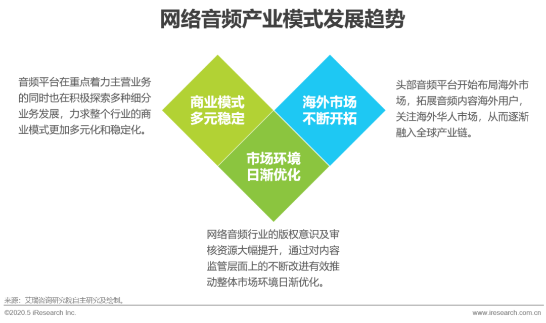 经过多年的发展,音频平台在重点着力自身主营业务的同时也在积极探索多种细分业务发展,力求整个音频行业的商业模式更加多元化和稳定化,从而形成更具规模的产业分布。从整个行业市场环境建构来看,网络音频行业的版权意识及团队审核资源大幅提升,通过对内容监管层面上的不断改进有效推动整体市场环境日渐优化,行业深入规范化发展。此外,头部音频平台开始布局海外市场,拓展音频内容海外用户,关注海外华人市场,从而逐渐融入全球产业链。