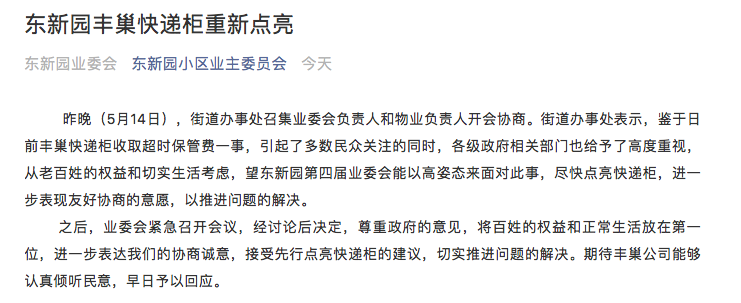 5月15日,全国第一个抵制丰巢快递柜“超时收费”的杭州东新园小区在其公众号发布消息,称所属街道办事处14晚召集业委会、物业负责人协商。之后业委会紧急召开会议,讨论决定,将百姓权益和正常生活放在第一位,进一步表达协商诚意,接受先行点亮快递柜的建议,推进问题解决,“期待丰巢公司认真倾听民意,早日回应。