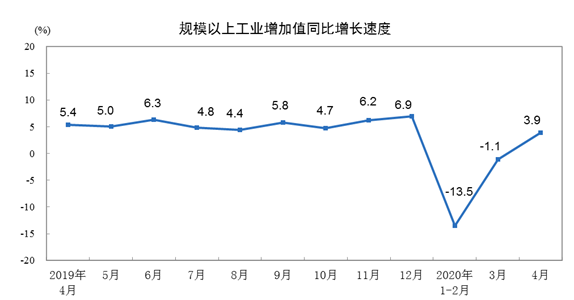 4月份,规模以上工业增加值同比实际增长3.9%(以下增加值增速均为扣除价格因素的实际增长率),上月为下降1.1%。从环比看,4月份,规模以上工业增加值比上月增长2.27%。1—4月份,规模以上工业增加值同比下降4.9%。