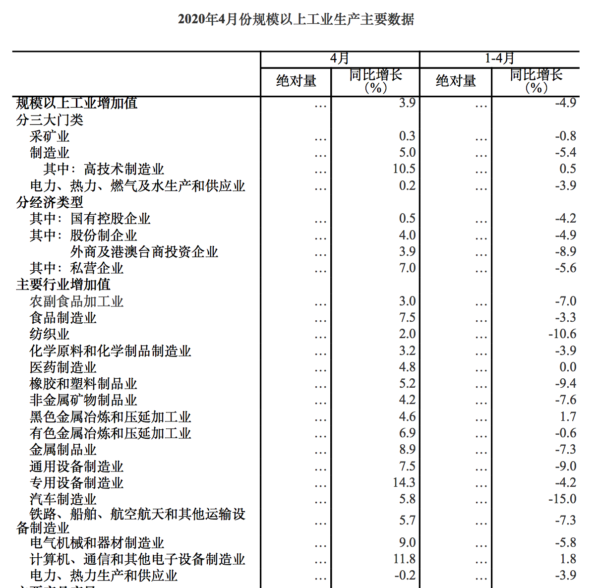 分三大门类看,4月份,采矿业增加值同比增长0.3%,增速比上月回落3.9个百分点;制造业增长5.0%,上月为下降1.8%;电力、热力、燃气及水生产和供应业增长0.2%,上月为下降1.6%。