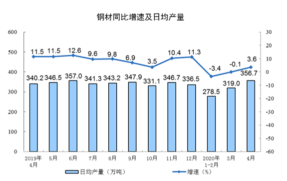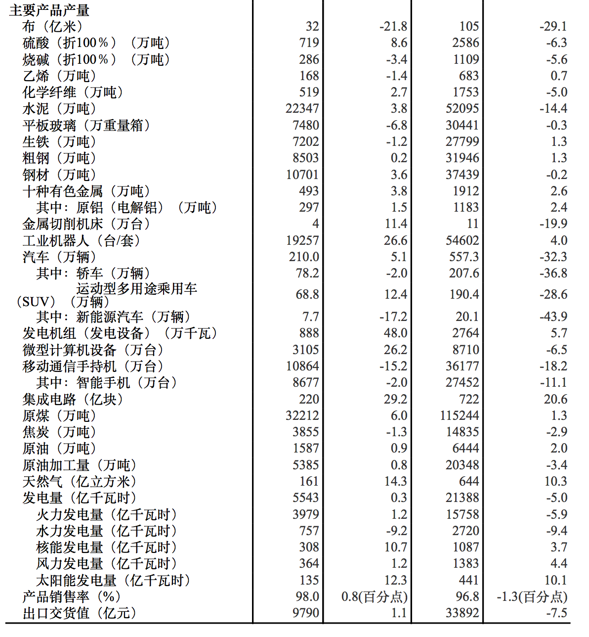 分产品看,4月份,612种产品中有367种产品同比增长。钢材10701万吨,同比增长3.6%;水泥22347万吨,增长3.8%;十种有色金属493万吨,增长3.8%;乙烯168万吨,下降1.4%;汽车210.0万辆,增长5.1%,其中,新能源汽车7.7万辆,下降17.2%;发电量5543亿千瓦时,增长0.3%;原油加工量5385万吨,增长0.8%。