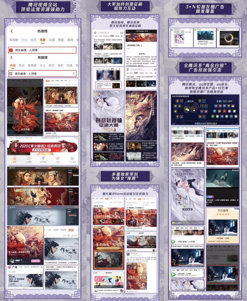 腾讯视频则从站内核心的推荐位、专题策划、图文短视频创意征稿,再到朋友圈的广告、电视端的海报等多维度的推广,为《倩女幽魂:人间情》提供了顶配资源的支持。