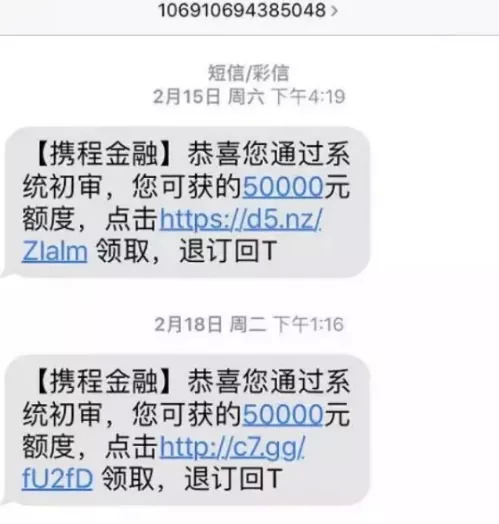 内容一般是“恭喜您通过系统初审,您可获的XXXXX元额度,月利率低至0.02%,最高可分36期,点击以下链接领取……”