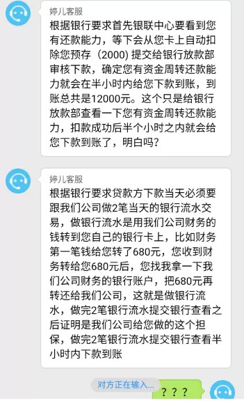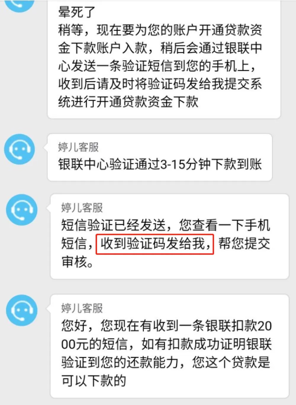 下载APP后会有专属客服提供审批贷款引导,在咨询的过程中以需要资金流水、验证还款能力等理由,要求受害人先向指定银行卡充钱、索要短信认证码等。