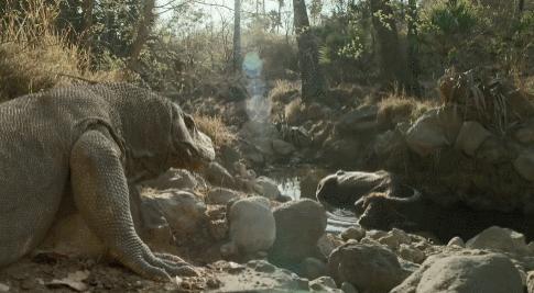 第一集的开头聚焦于印度尼西亚的科莫多巨蜥。这是一种体长超过3米,嘴边挂着毒液的巨兽,可以轻松撂倒一头体型是它三倍的水牛,并将其生吞活剥。
