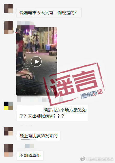 据@温州网警巡查执法,5月14日晚,在微信群流传一则“蒲鞋市街道发现新冠肺炎疑似病例”的视频。经鹿城区疾控中心核实,目前,该区没有发现疑似病例。该消息为谣言!希望广大网民,不信谣,不造谣,不传谣。