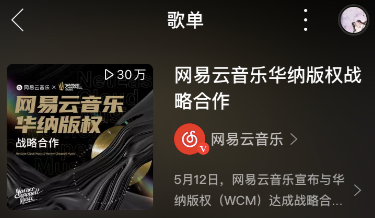 消息公布同时,网易云音乐也分享了一份华纳版权主题歌单,截至目前,播放次数已超30万次。