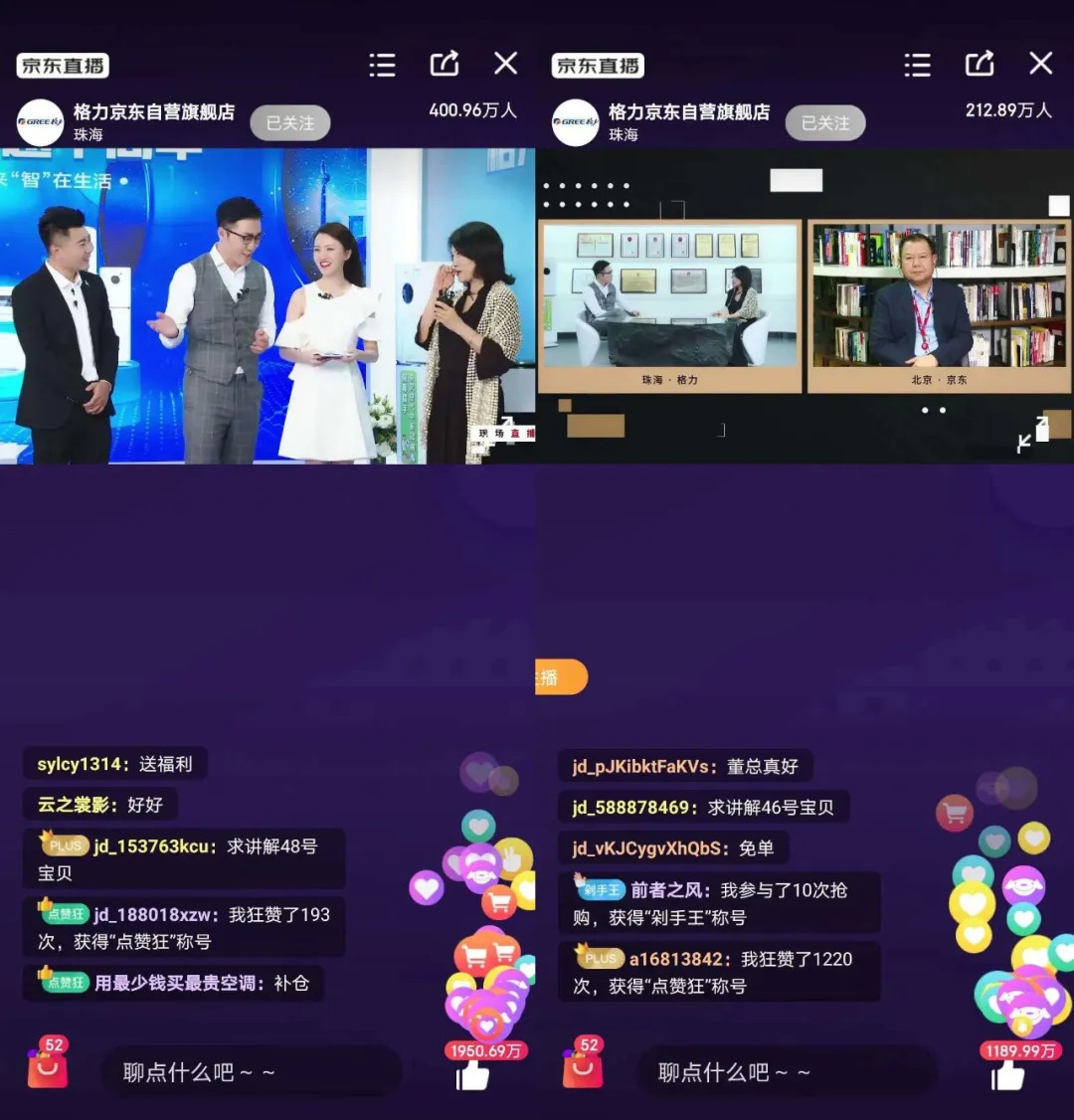 在京东直播平台迎接董小姐的是科技测评达人王自如。他在罗永浩直播首秀后的一周正式加入京东直播。昨晚直播的前47分钟是访谈环节,王自如负责向董明珠抛出问题,过程中还与京东副总裁闫小兵进行了连线。