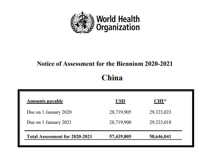 在美国宣布对世卫组织断粮之前,2020-2021年度缴费通知单显示,美国今年和明年的会费已减至每年5788万美元。中国今明两年的会费约为每年2872万美元。