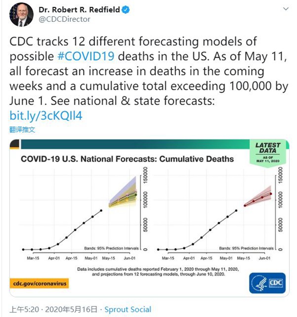 美国疾控中心主任雷德菲尔德周五晚在Twitter发文指出,疾控中心对12种不同模型预测进行了追踪,所有模型预测都显示,到6月1日,美国的累计死亡将超过10万例。
