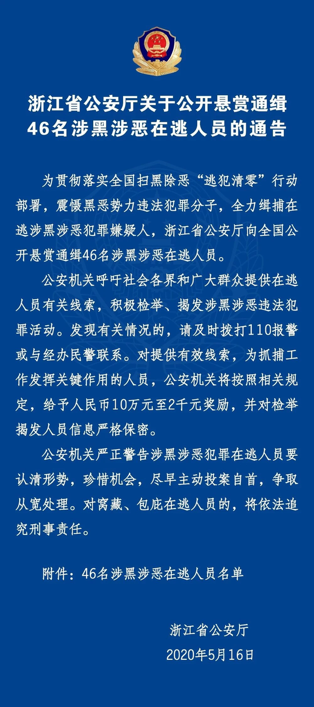 据浙江省公安厅官方微信公众号民生66最新消息,浙江省公安厅公开悬赏通缉46名涉黑涉恶在逃人员,最高奖励10万元。
