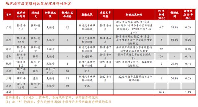 在限购城市里,牌照直接抑制了汽车消费需求。限购和限行相伴而行,没有当地牌照,出行路径将受到限制,这极不利于上班一族。当政府向市场发放更多牌照后,将推动购新车需求。华西证券以目前限购松绑城市判断,2020年全国总新增(新车)需求约24.7 万个,相当于2019 年国内乘用车销量的1.2%。放松限购前限购城市年均牌照指标整体约70 万个,占国内乘用车销量的3%。