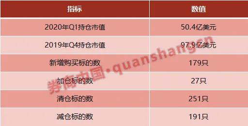桥水基金向美国证监会(SEC)提交的持仓报告显示,截至2020年一季度末,桥水的美股持仓市值为50.4亿美元,相较于上一季度末的97.9亿美元,环比减少48.5%,清仓股票数量高达251只。