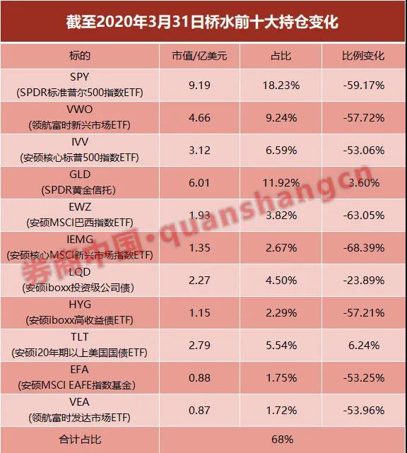 上表显示了截至一季度末,桥水前十大持仓的变化,可以看到,包括标普、新兴市场指数等在内的股票指数ETF均被砍去了超过一半的仓位,其中安硕核心MSCI新兴市场指数ETF减仓最重,环比降低了68.39%。除此以外,公司债、高收益债等品种也被降低了仓位。