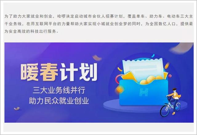 因此,多家平台推出合伙人制度。3月5日,哈啰出行启动合伙人招募计划,单车、助力车以及车服系统都推出了加盟模式。