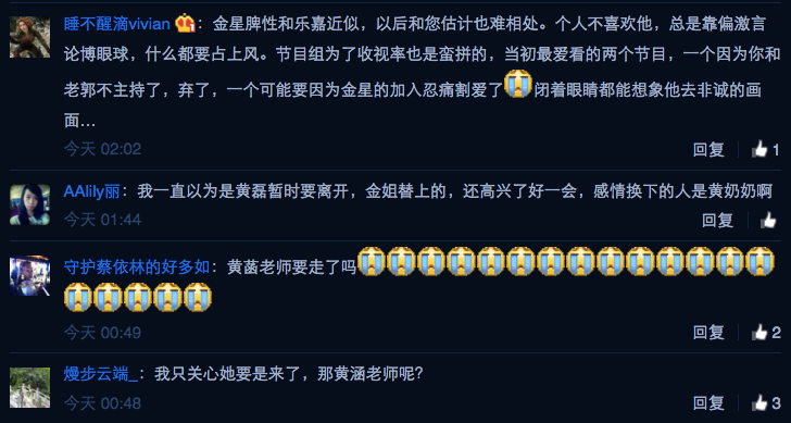 在金星有可能代替黄菡担当点评嘉宾的消息爆出后,观众也找出此微博,并给孟非留言,分析金星和黄菡的不同之处,甚至担心金星的暴脾气会最终导致她与孟非起冲突。