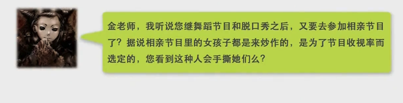 早前金星曾在自己的节目《金星秀》中吐槽过相亲节目造假,而在光棍节播出的最新一期《金星秀》中,在回答网友问题环节里,有网友询问金星是否要去参加相亲节目,会不会手撕女嘉宾。