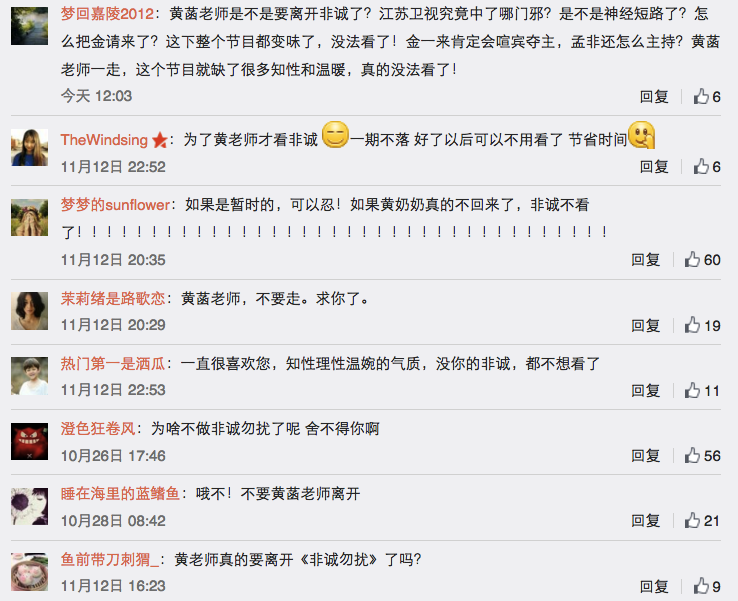 在黄菡的微博下,一水的留言都是不舍其离开,甚至由网友表示,如果黄菡离开,自己将不再看《非诚勿扰》。