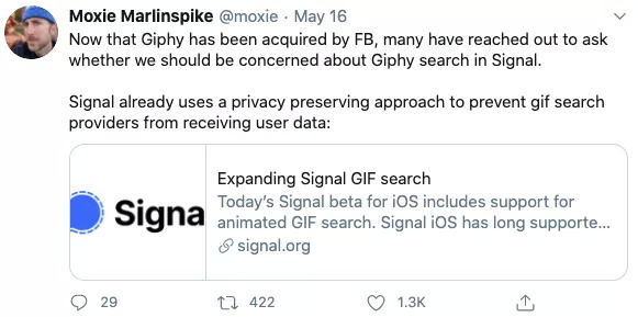 根据Signal创始人Moxie Marlinspike的说法,该应用采取了保护用户隐私举措。这意味着Facebook可能无法从Signal上共享的Giphy GIF中获取任何数据。