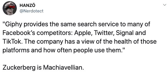 Facebook收购Giphy后,它就可以收集到其他平台用户使用的数据。网友表示,「扎克伯格就是马基雅维利主义者」。