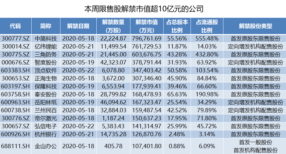 同时,解禁市值超过10亿元的上市公司合计有14家,中简科技、亿纬锂能(300014.SZ)解禁市值均超过70亿元,三角防务(300775.SZ)解禁市值超过60亿元。