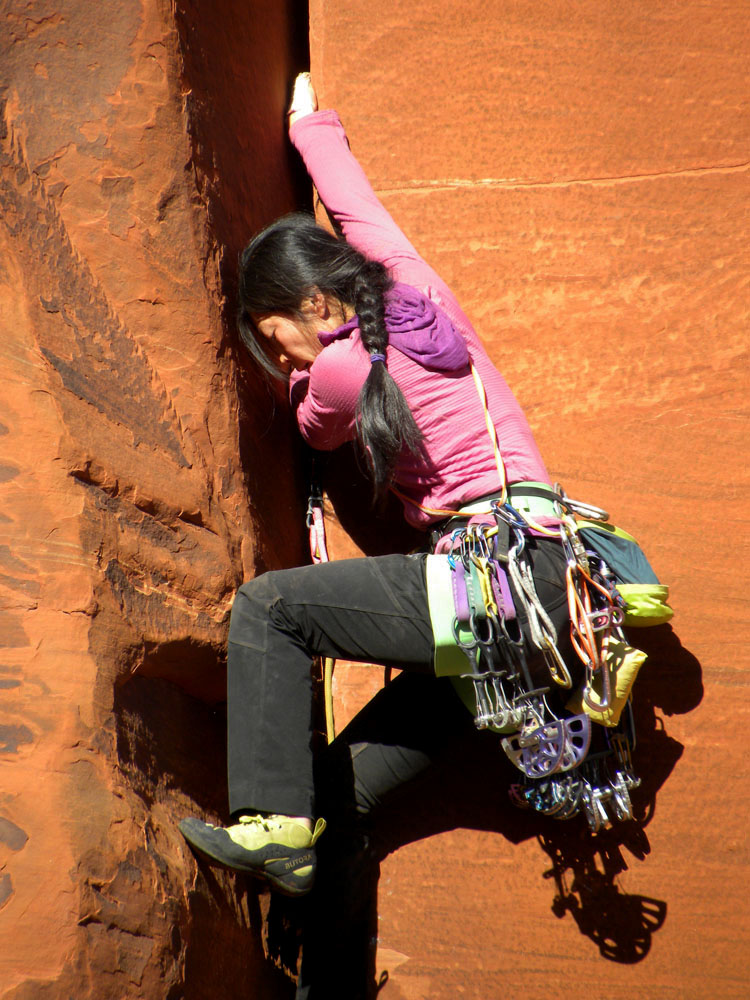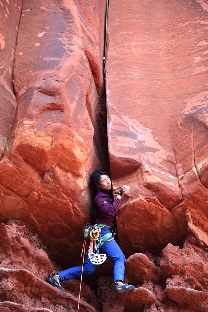 虽然这条路线在最初并没有达到此前易思婷和刘赟卿的选塔标准,但两个人不约而同的都对这个线路产生了兴趣——两人都卡在了第一段同一处宽缝,又分别以不同的攀爬方法解决了难题。