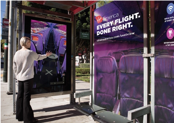 而在线下,维珍美国还联合创意公司Eleven,在纽约、旧金山、洛杉矶等地的巴士车站安装了同样具有“街景”功能的机场内部图片。行人可以通过操纵手势查看维珍空客A320机型的内部构造。
