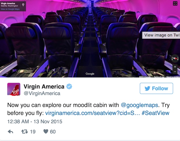 11月13日,维珍航空美国公司在Twitter上宣布了一则新消息,“起飞之前试试新功能吧,你可以在Google Map里看到机舱的样子哦。”
