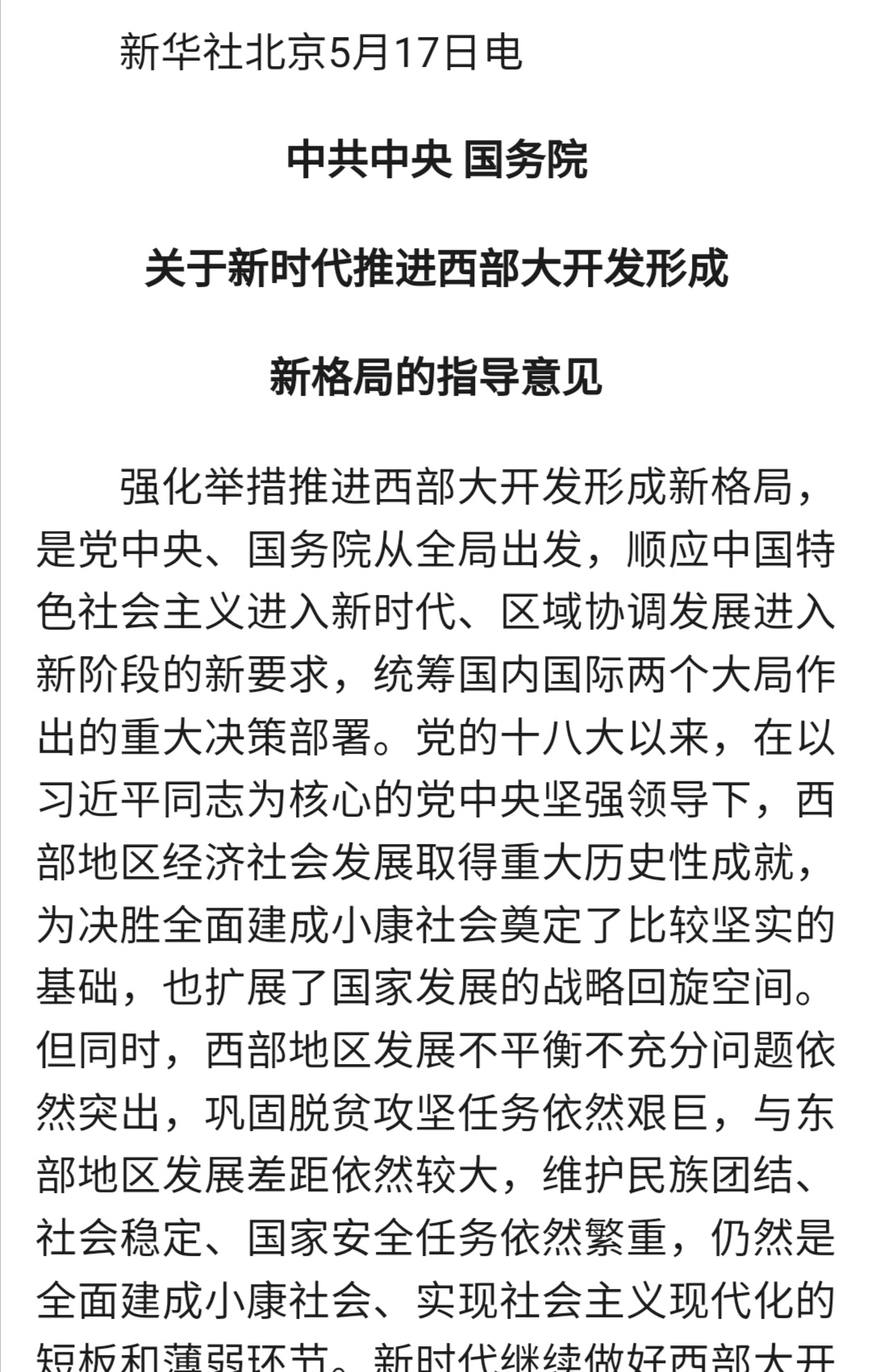 2020年5月17日,新华社受权发布《中共中央国务院关于新时代推进西部大开发形成新格局的指导意见》(以下简称《意见》),共七大点三十六条,包括:贯彻新发展理念,推动高质量发展;以共建“一带一路”为引领,加大西部开放力度;加大美丽西部建设力度,筑牢国家生态安全屏障;深化重点领域改革,坚定不移推动重大改革举措落实;坚持以人民为中心,把增强人民群众获得感、幸福感、安全感放到突出位置;加强政策支持和组织保障。
