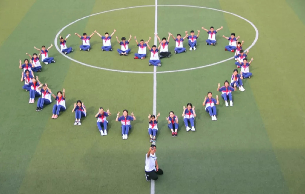 久违的大操场上,全班同学摆成了“心”形队伍(青浦区珠溪中学)