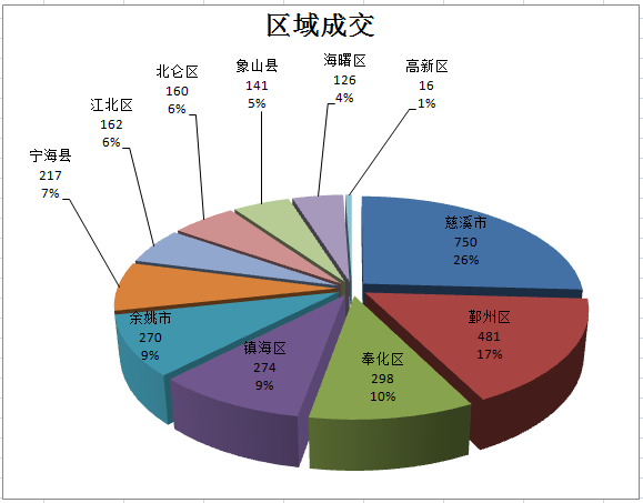 从区域成交来看,上周大市成交排名前三的依次是慈溪市、鄞州区、奉化区。上周慈溪市新房共成交750套,占成交总量的26%,位于区域第一;对比前一周(成交970套),环比减少约22.7%;而鄞州区上周住宅成交共481套,位列区域第二,环比前一周上涨约19.7%;奉化区上周住宅成交298套,占成交总量的10%,位列区域第三。
